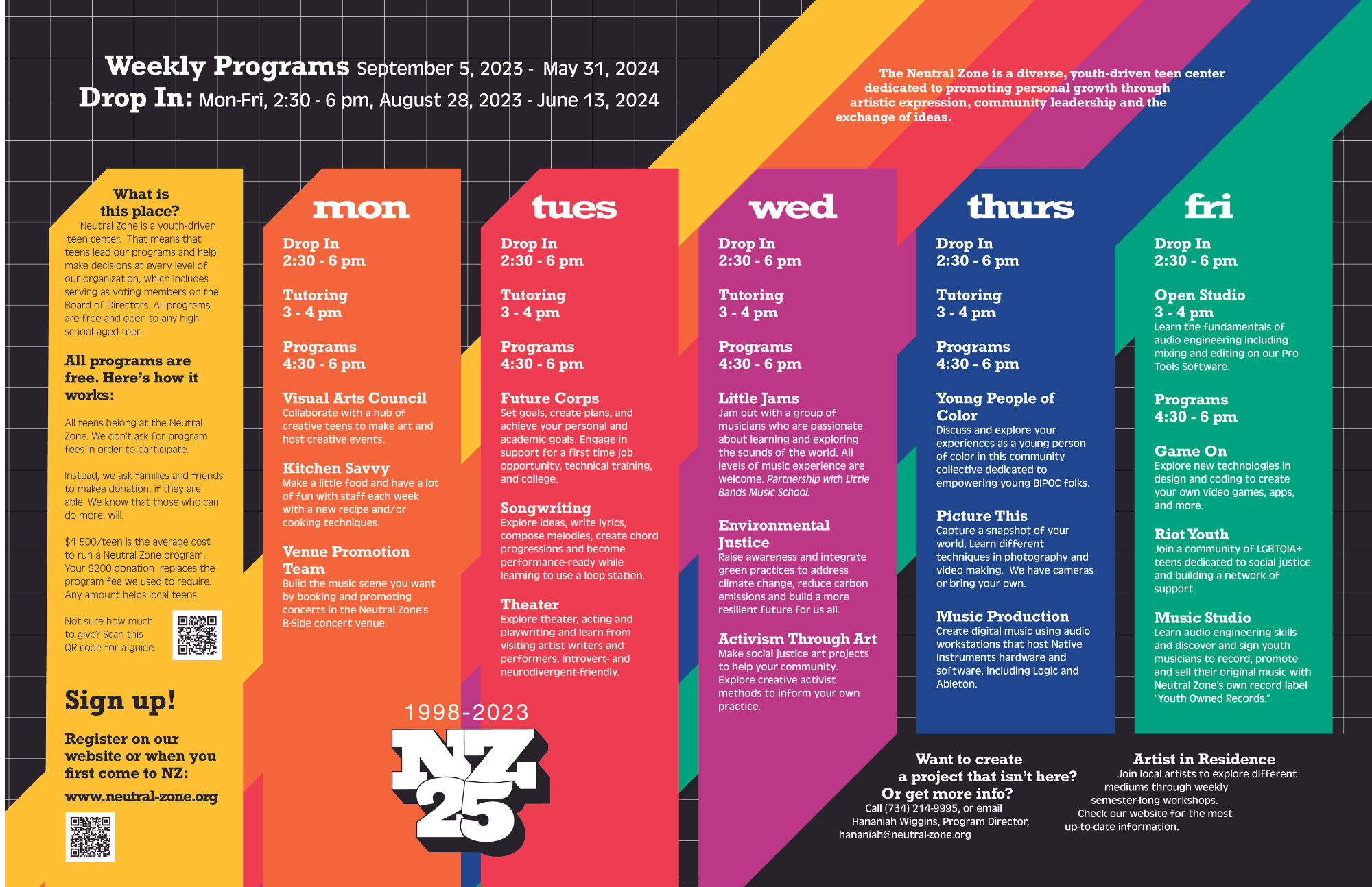 Neutral Zone is a transformative, youth-driven community where youth embrace their power, ignite their creativity, and launch their future to build equity, justice, and collective liberation.