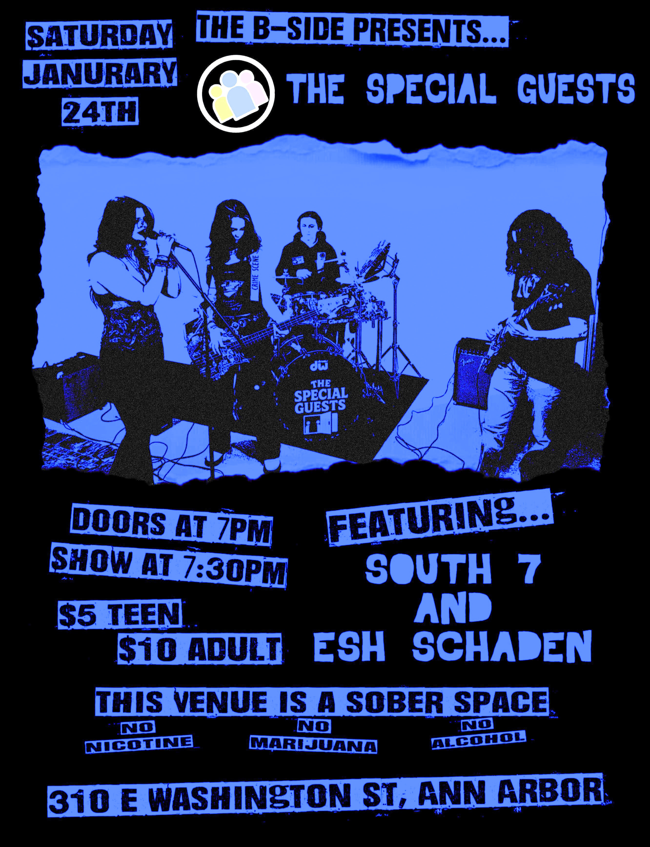 B-Side Concert: The Special Guests Saturday, January 24, 2026 7:00 PM 10:00 PM Neutral Zone 310 E Washington St Ann Arbor United States (map) Google Calendar ICS The B-Side Presents The Special Guests on Saturday, January 24th, featuring South 7 and Esh Schaden. Doors at 7, show at 7:30. Admission is $5 for teens, $10 for adults - no one is turned away due to lack of funds.
