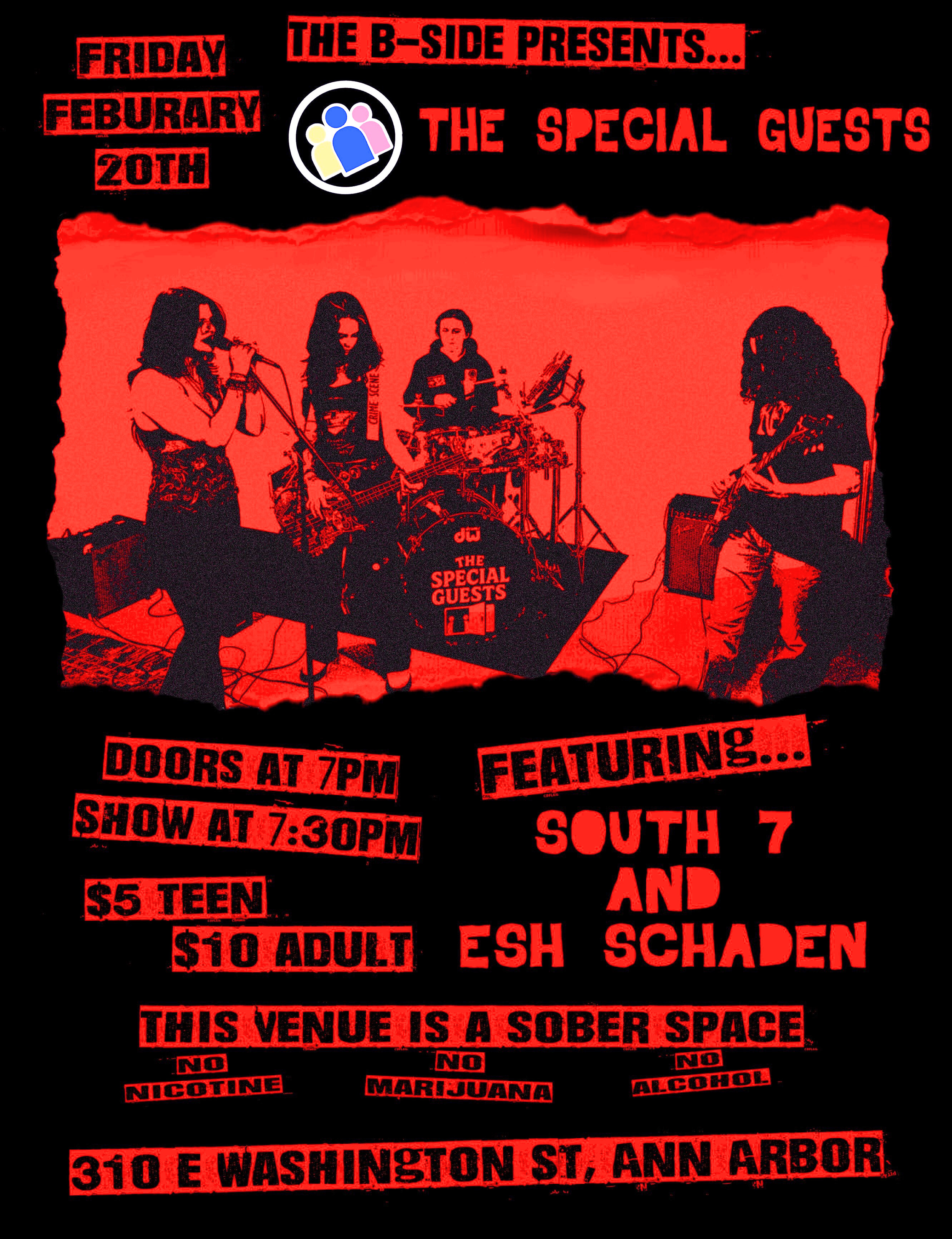 Back to All Events NEW DATE B-Side Concert: The Special Guests Friday, February 20, 2026 7:00 PM 8:00 PM Neutral Zone 310 E Washington St Ann Arbor United States (map) Google Calendar ICS The B-Side Presents The Special Guests on Saturday, February 20th, featuring South 7 and Esh Schaden. Doors at 7, show at 7:30. Admission is $5 for teens, $10 for adults - no one is turned away due to lack of funds.