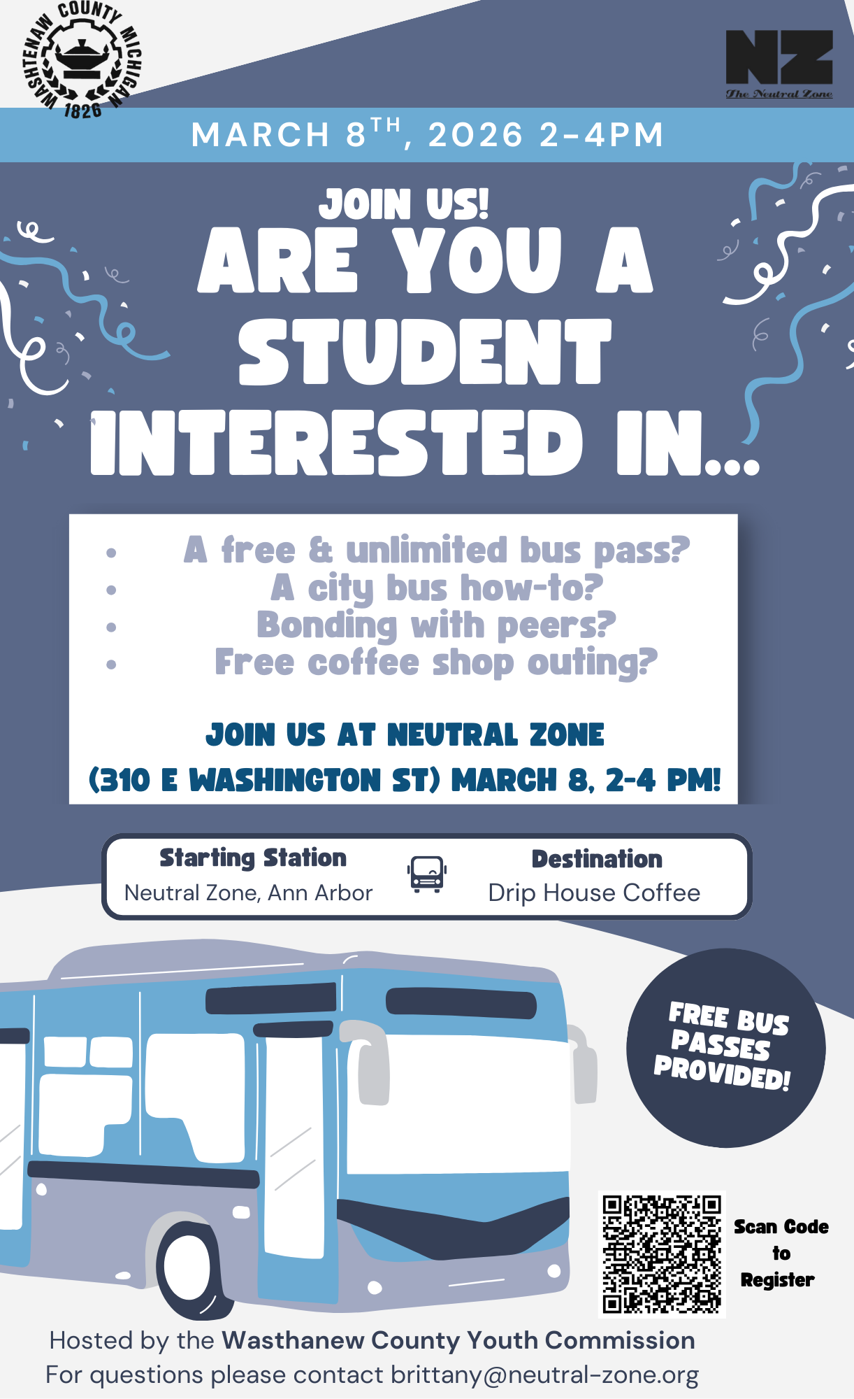 Are you a student interested in … a free and unlimited bus pass? A city bus how-to? Bonding with peers? Free coffee shop outing? Join the Washtenaw County Youth Commission at the Neutral Zone on Sunday, March 8th from 2-4 PM.