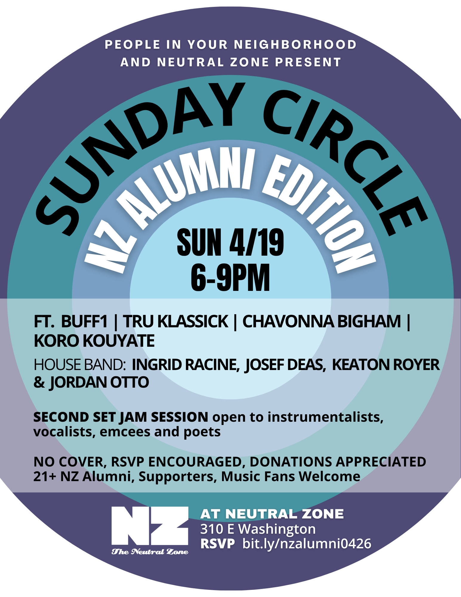 Join us Sunday, April 19th from 6-9 PM for a special, 21 & over only concert featuring regulars from the Sunday Circle series at Ziggy’s alongside standout NZ Alumni performers. Come hear performances from Buff1, Tru Klassick, Chavonna Bigham and Koyo Kouyate, and stay for house band Ingrid Racine, Josef Deas, Keaton Royer & Jordan Otto in a jam session open to instrumentalists, vocalists, emcees and poets.