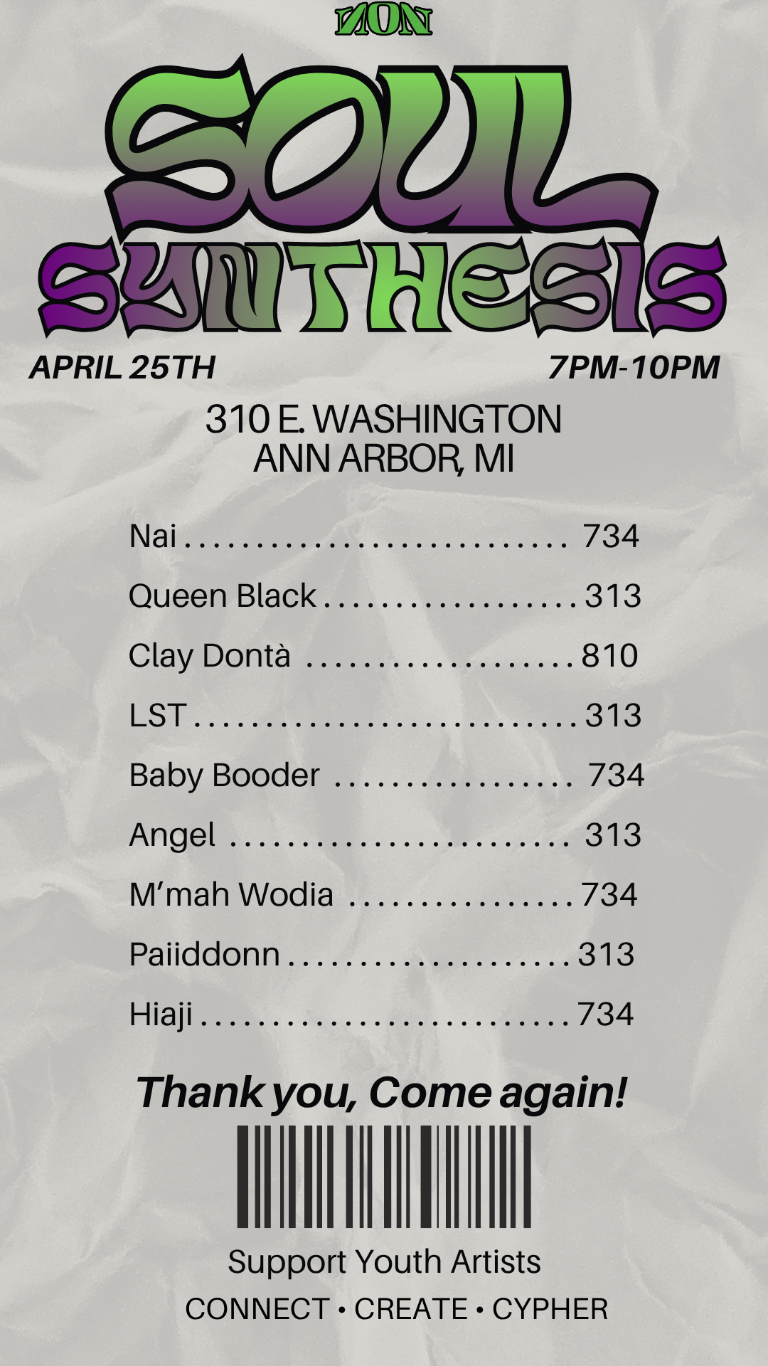 Soul Synthesis Saturday, April 25, 2026 7:00 PM 10:00 PM Neutral Zone 310 E Washington St Ann Arbor United States (map) Google Calendar ICS Soul Synthesis draws on youth hip hop talent from youth across the area codes of SE Michigan for a concert at Neutral Zone on April 25th, 7-10pm. Free at Neutral Zone's B-Side Venue - 310 E Washington Street, Ann Arbor.Featuring artists - Nai, Queen Black, Clay Donat, LST, Baby Booder, Angel, M'ma Wodia, Paliddonn and Hiaji. Welcoming any artists who want to connect, create music and join our community cypher. Free