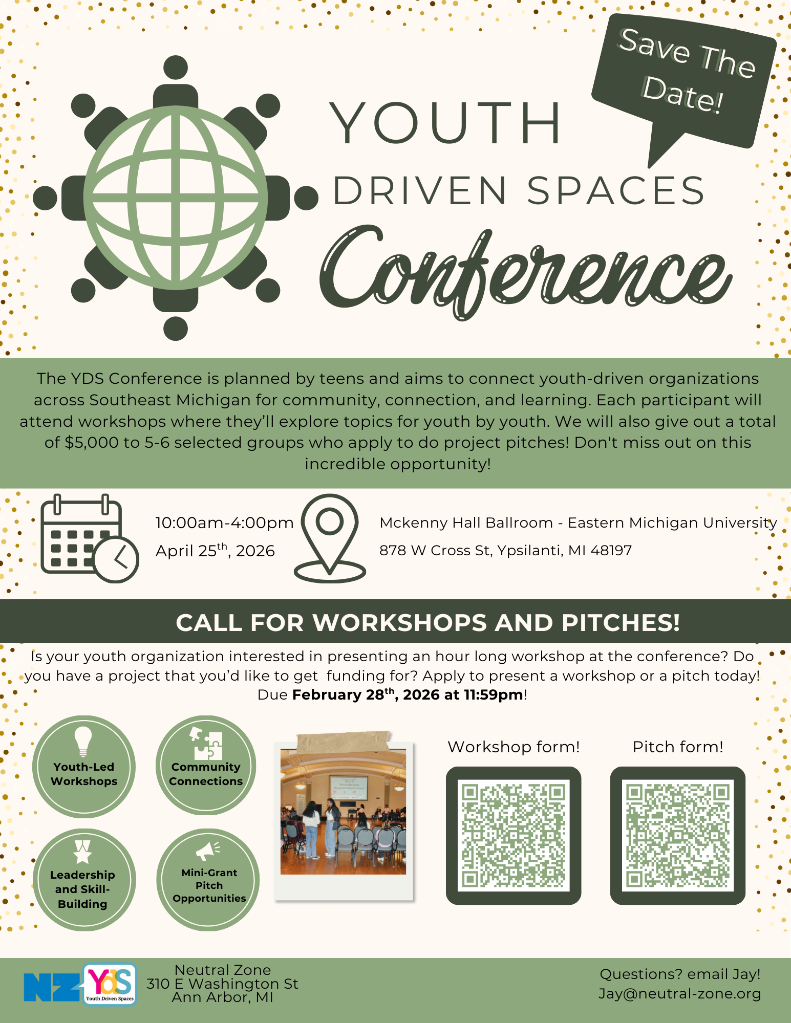 Save the Date! The Youth Driven Spaces Conference will be on Sunday, April 26th in the McKenney Hall Ballroom at Eastern Michigan University.